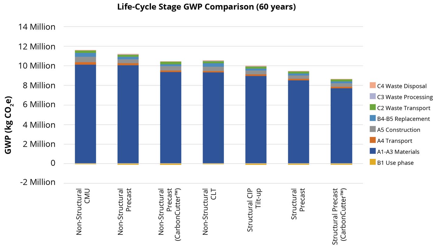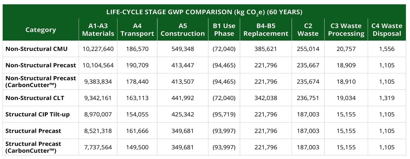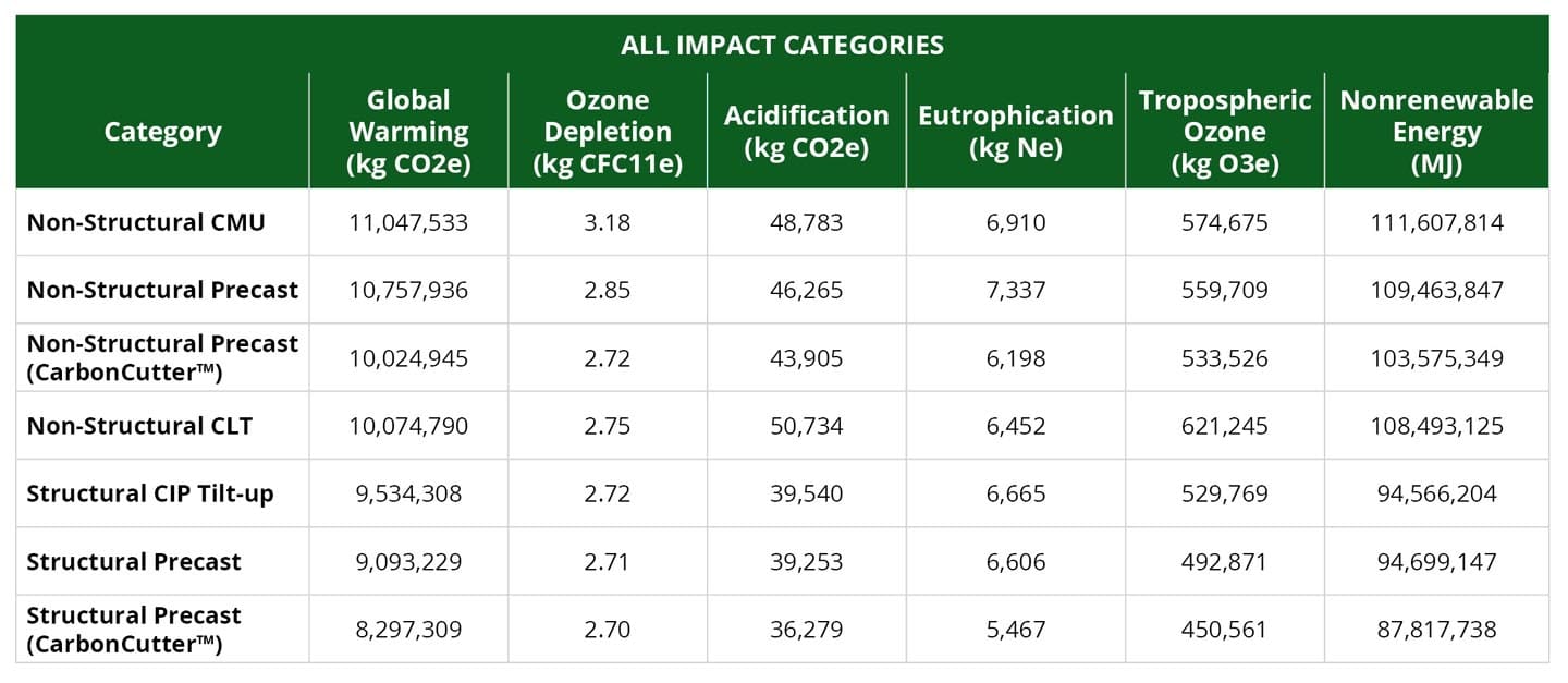 In a recent comparative life cycle assessment (WBLCA) of a 297,000-sf high-mass building, Knife River’s CarbonCutter™ precast solution achieved significant reductions in foundation, steel framing, and lateral system materials.
